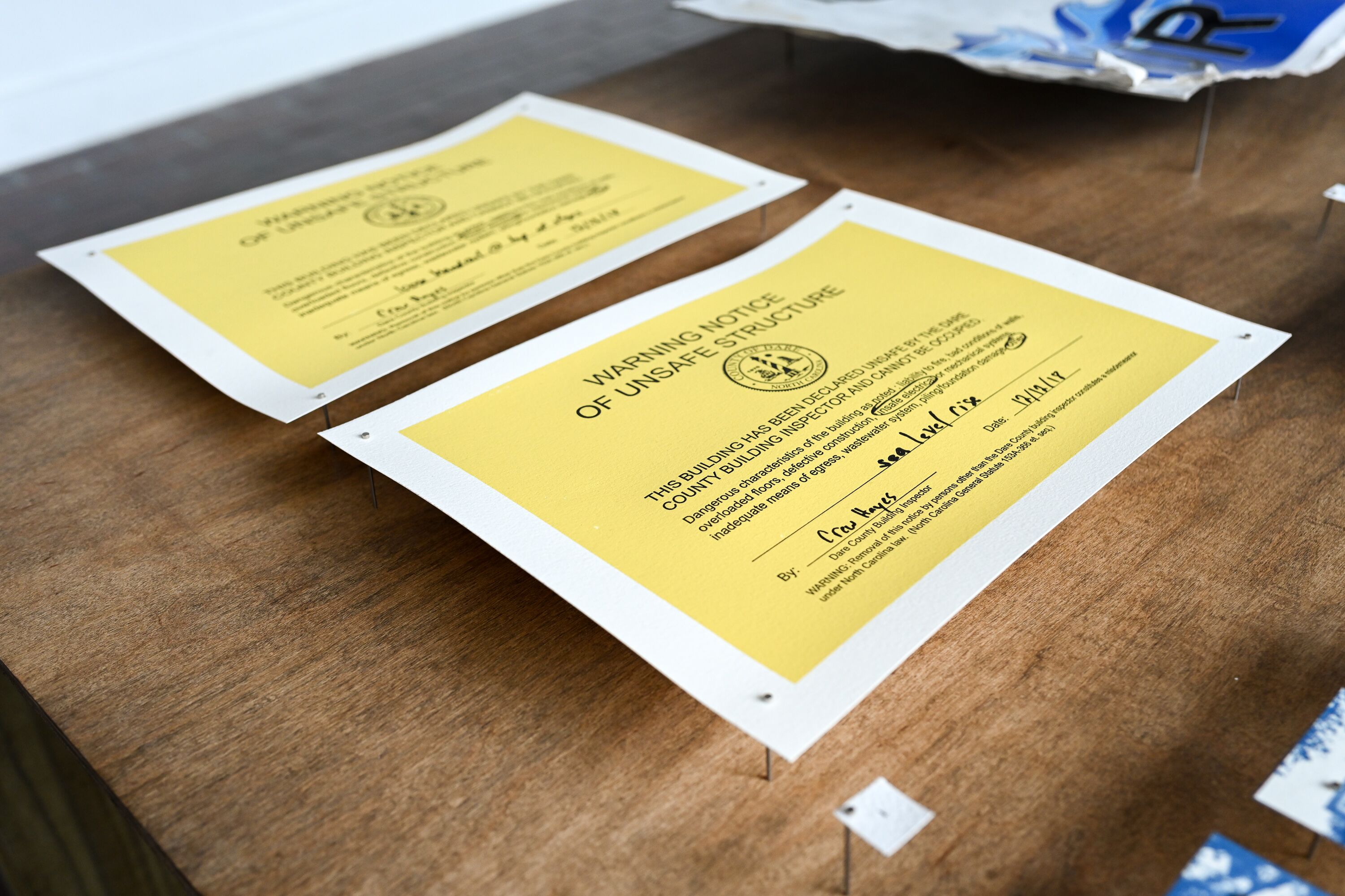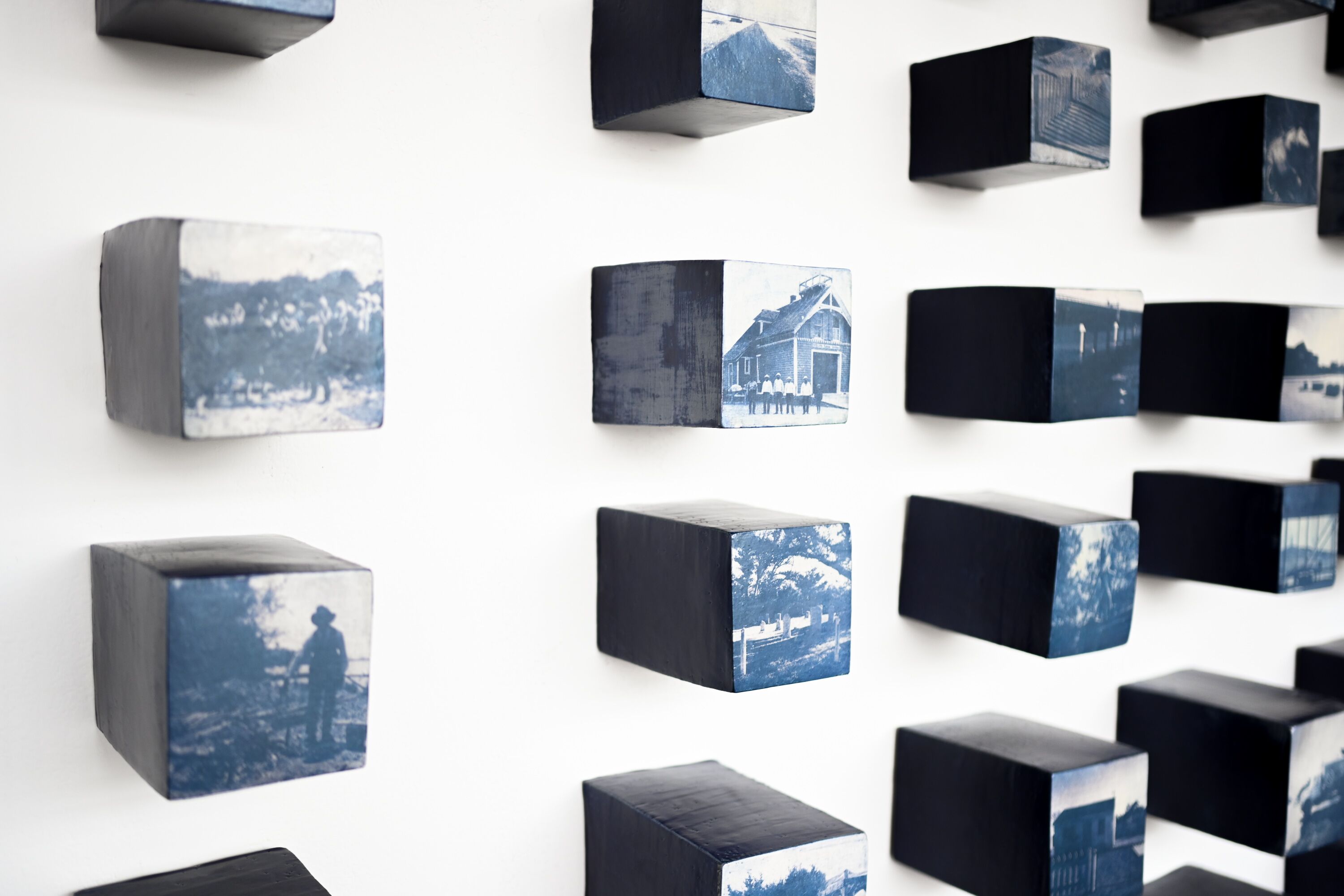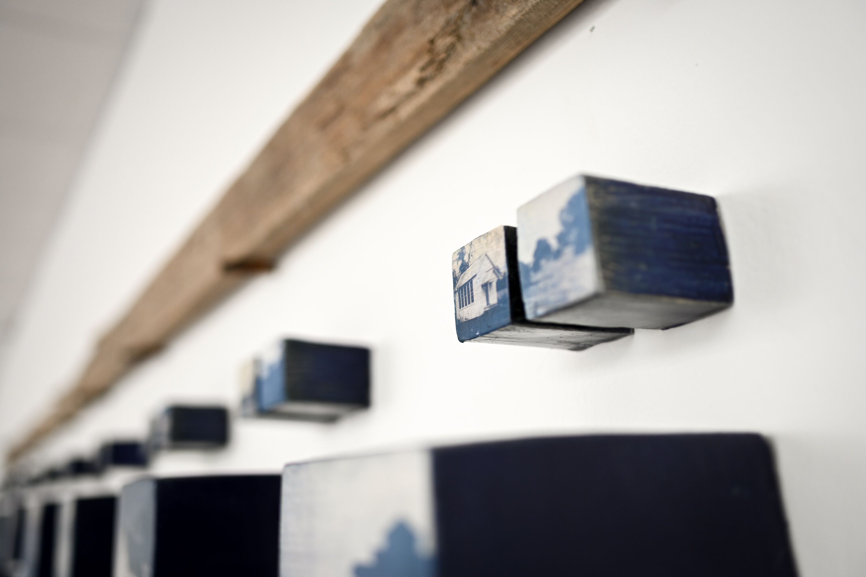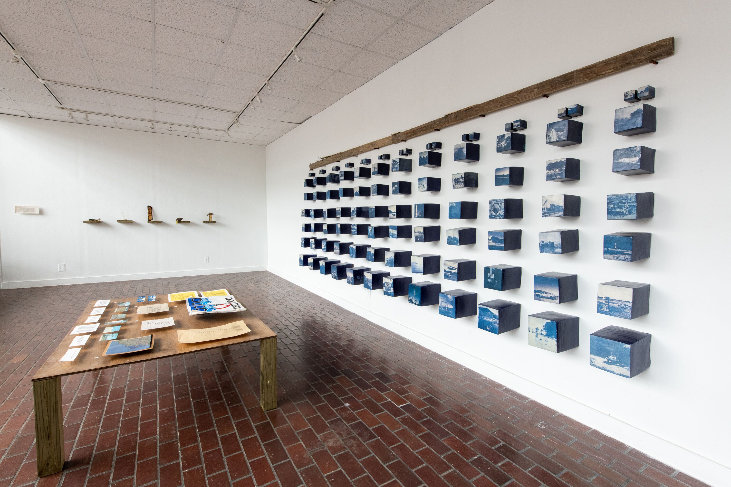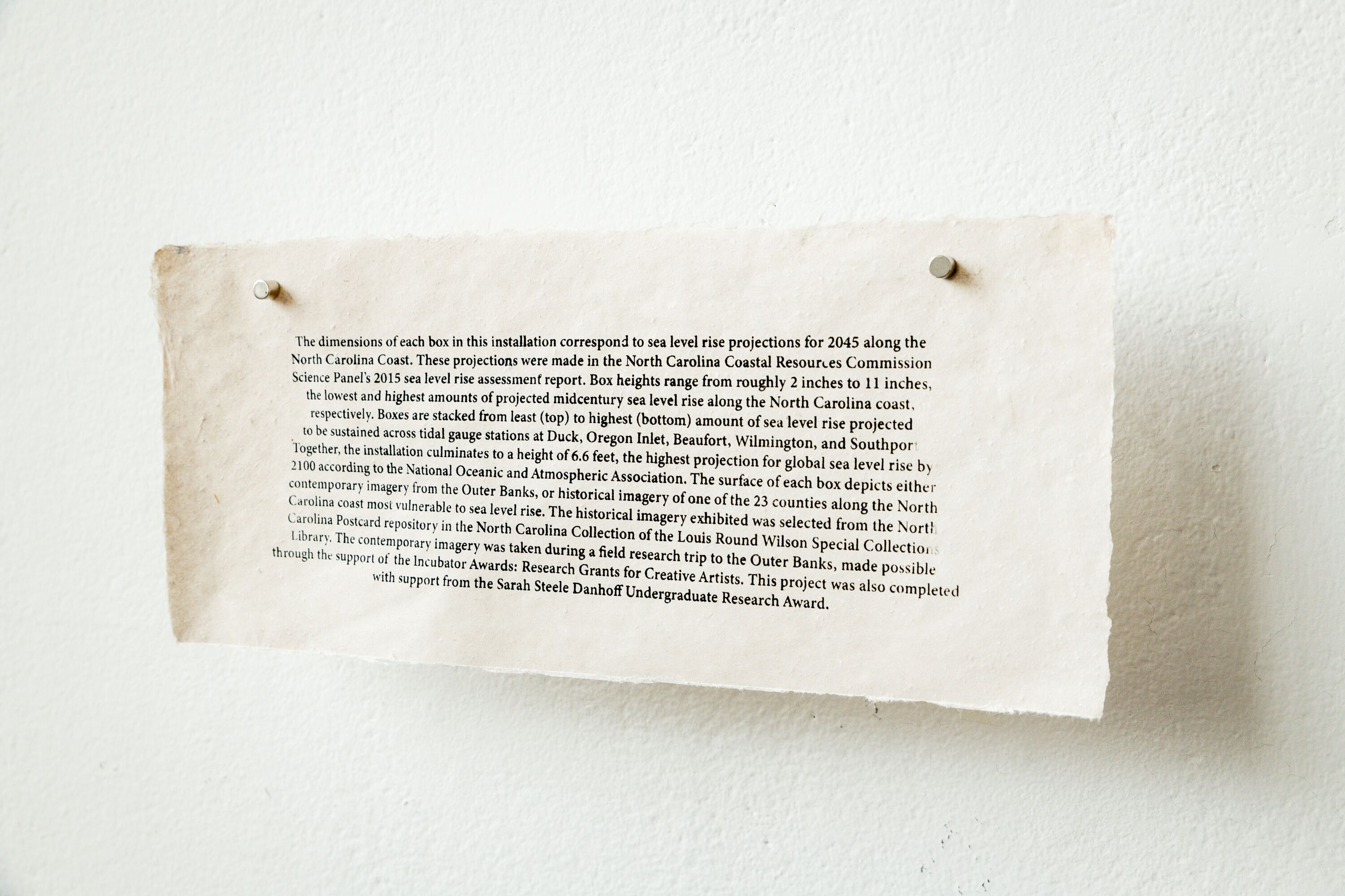 This installation concentrates on visual quantification of sea level rise projections for the North Carolina coast line by mid-century. Employing hybrid strategies of data visualization inclusive of photography, found object art, and printmaking, I have created ceramic boxes depicting contemporary and historic imagery of the 23 NC coastal counties that are impacted by sea level rise. The dimensions of these boxes correspond to the ranges of sea level rise that are predicted under best-case and worst-case emissions scenarios for 2045. Boxes are mounted on the wall to a height of 6.6 feet, the highest projection for global sea level rise by 2100.