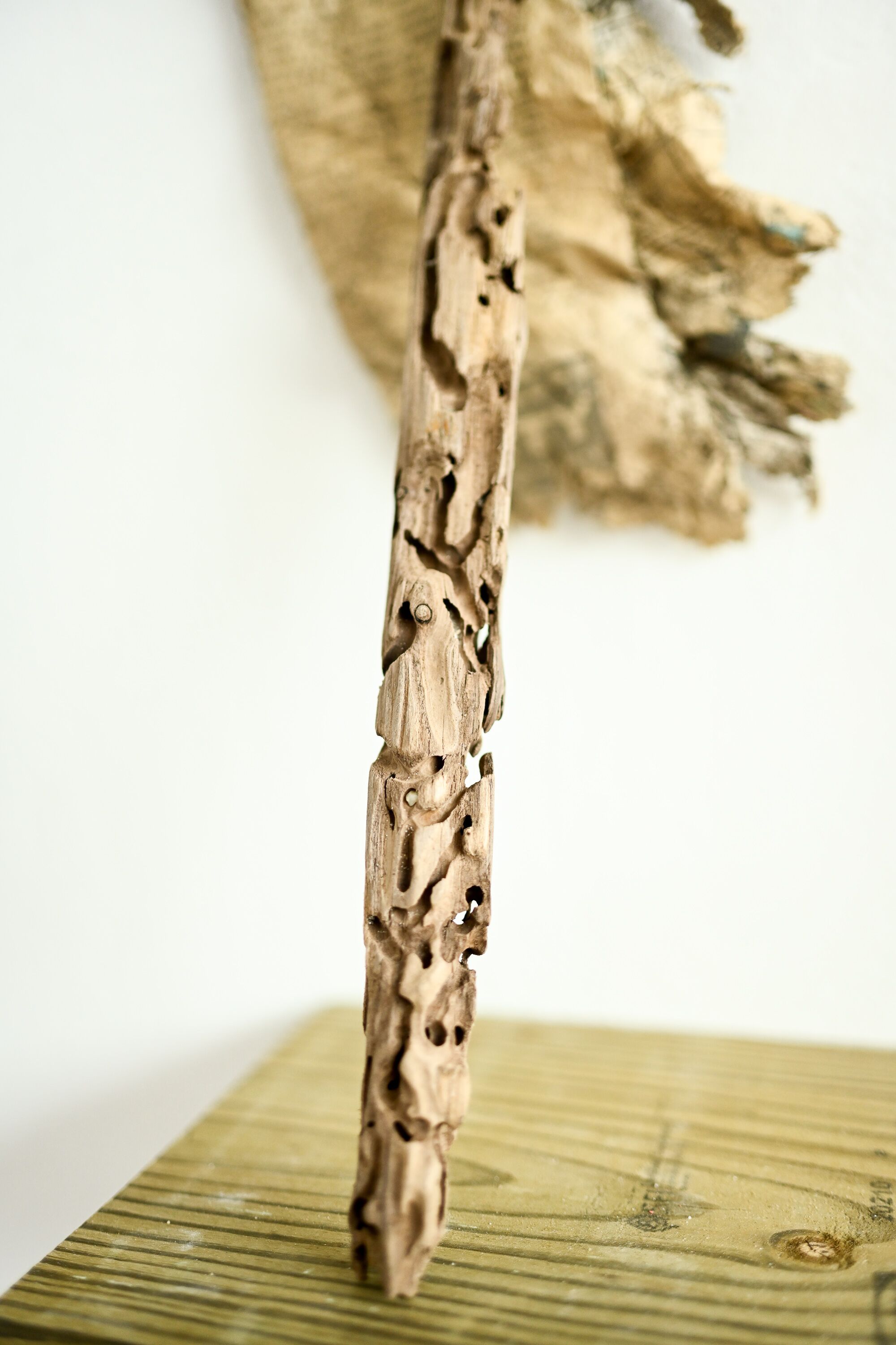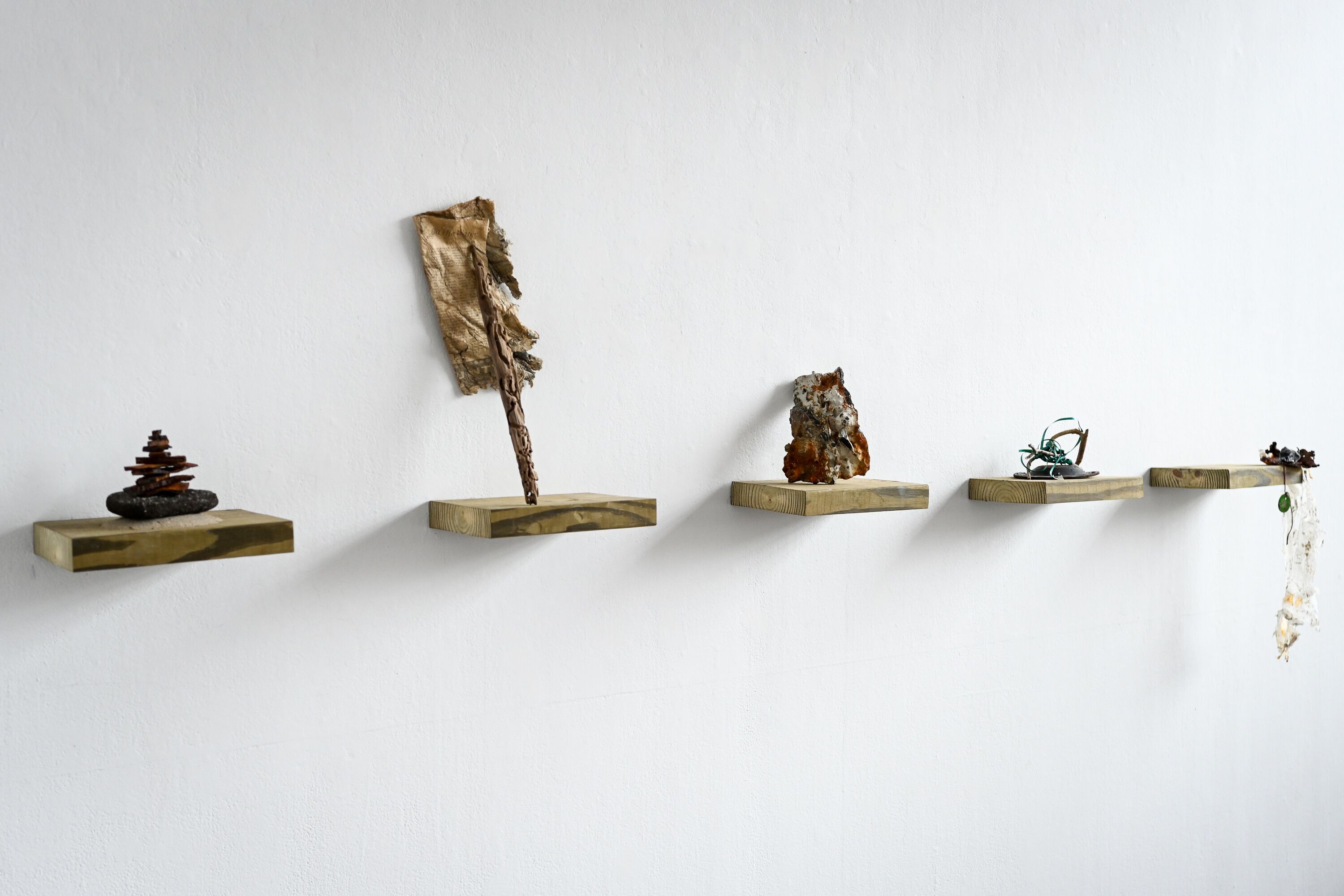 (2019) glazed stoneware, decals, severe weather lumber, found wood, found objects; installation dimensions variable