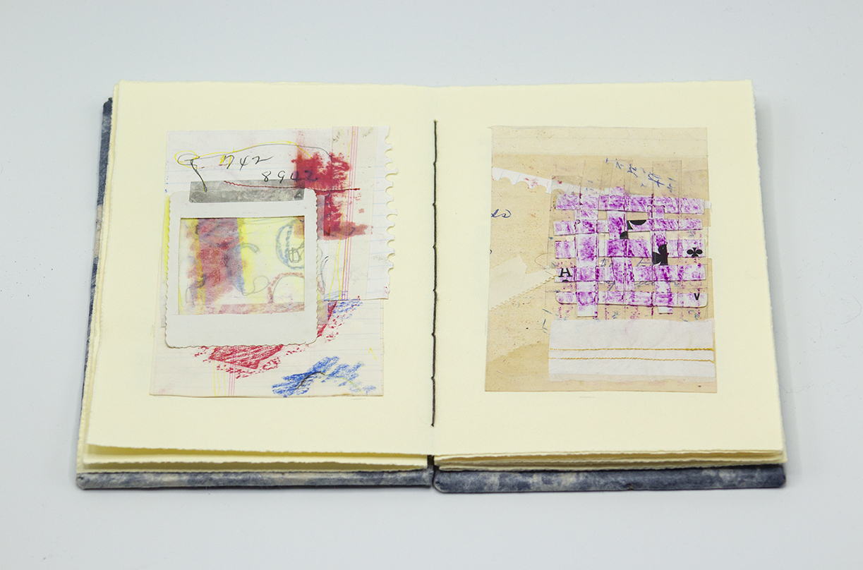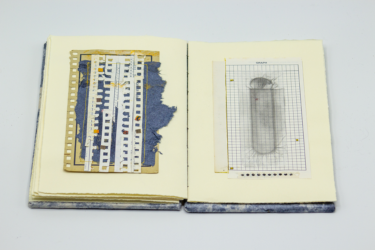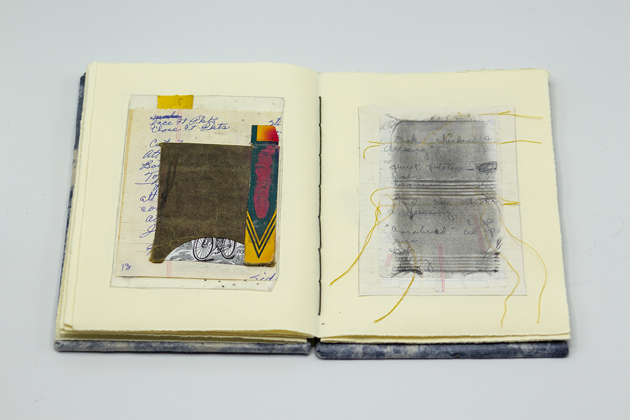 (2021) edition of 1; 5” x 8”, found materials, handmade denim paper, etching plate, Rives Lightweight paper, waxed thread