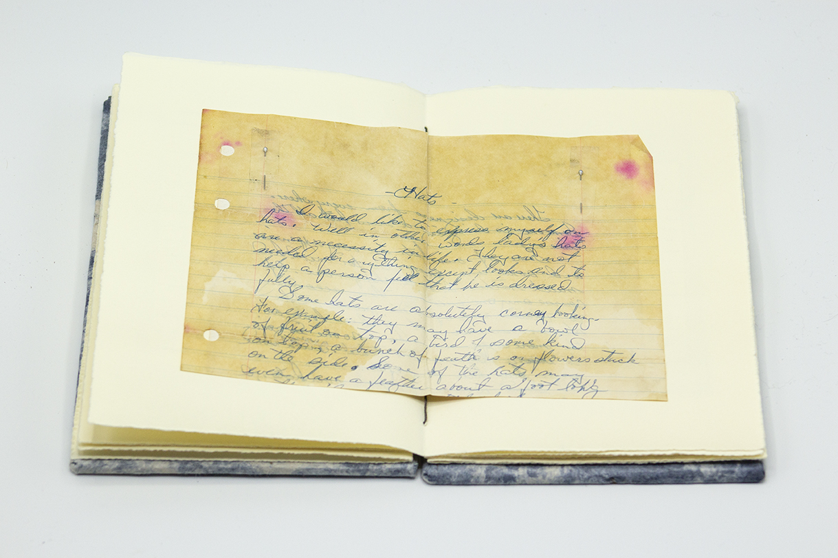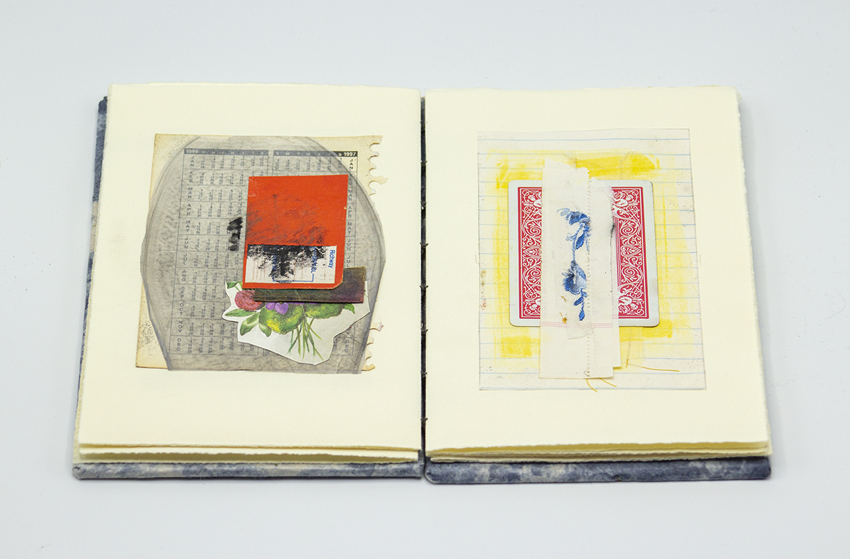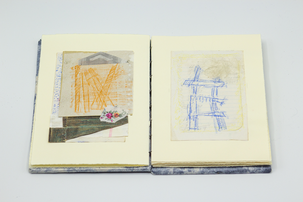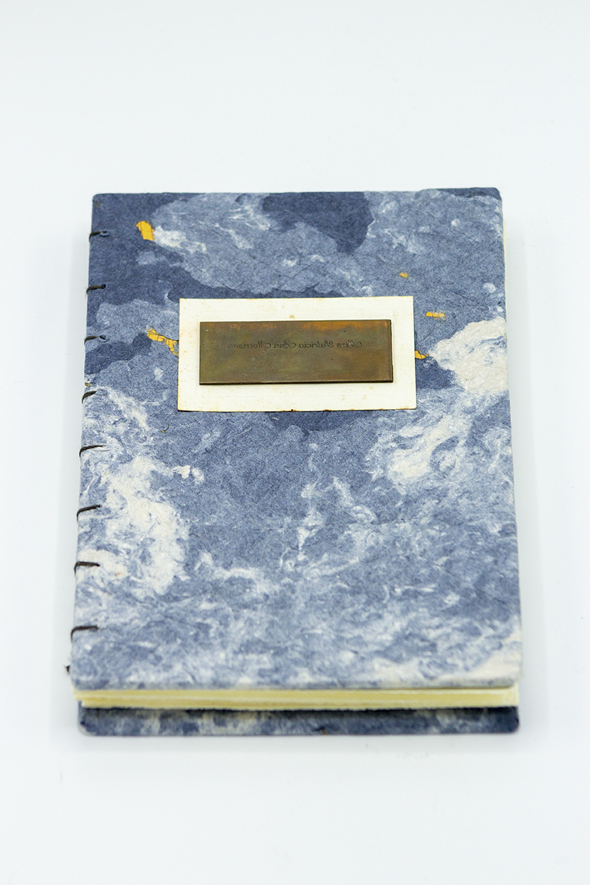 (2021) edition of 1; 5” x 8”, found materials, handmade denim paper, etching plate, Rives Lightweight paper, waxed thread